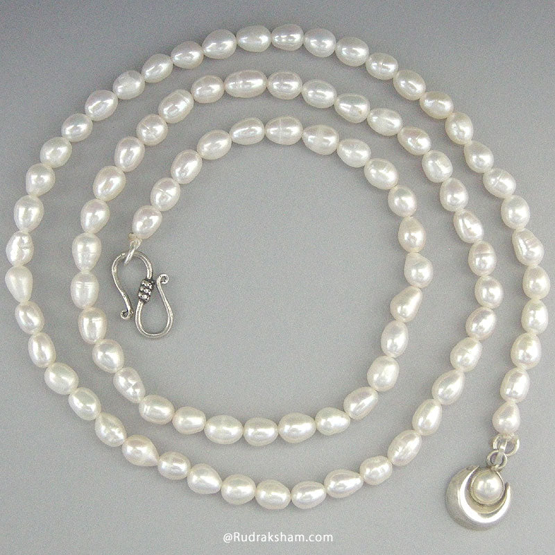 Mala Details : White Pearl Gemstone beads Necklace in a strong nylon thread with Half Moon / Chandrama Silver Pendant.