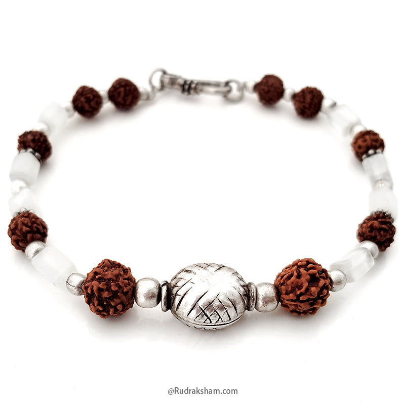 Bracelet Details : Bracelet made from Grey Moonstone gemstone beads and 5 Mukhi Rudraksha beads with Silver Accessories.