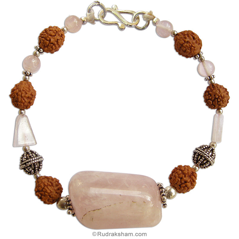Bracelet Details : Silver Jewelry Bracelet made with Rose Quartz Crystal gemstone beads, 5 Mukhi Rudraksha Beads and silver Accessories.