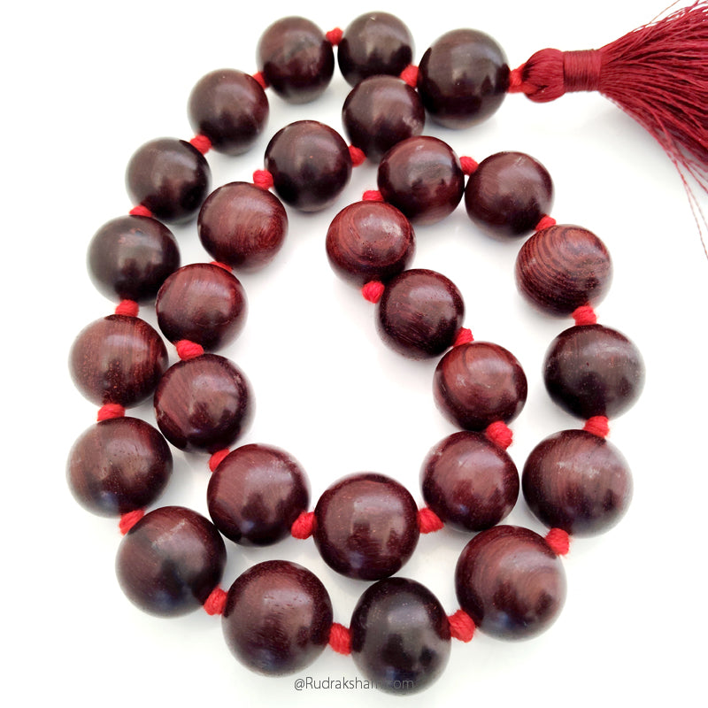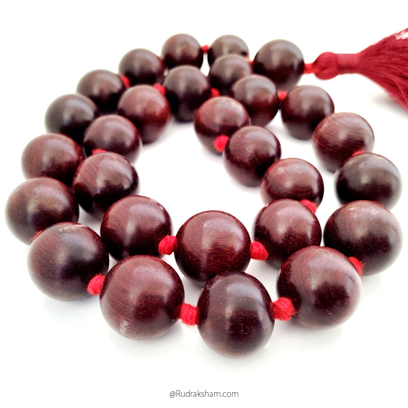 Mala Details : Red Chandan beads knotted in thread in traditional style with tassel.