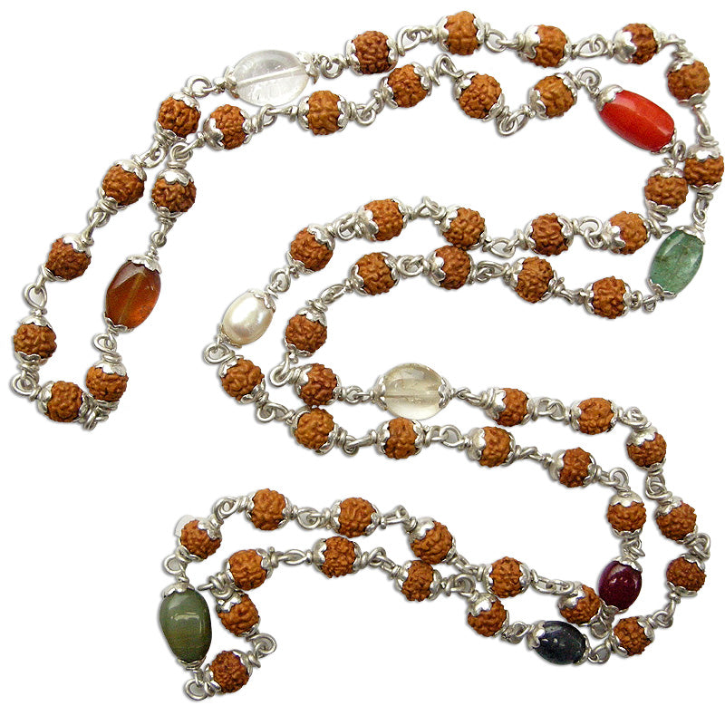 These rosaries (Mala) are made in combination of small five Mukhi Rudraksha beads with Coral, Sphatik and Pearl. These are made in strong thread and with silver accessories and are made as per Puranas. These can be used for Japa and for wearing purpose for health, peace and spirituality.