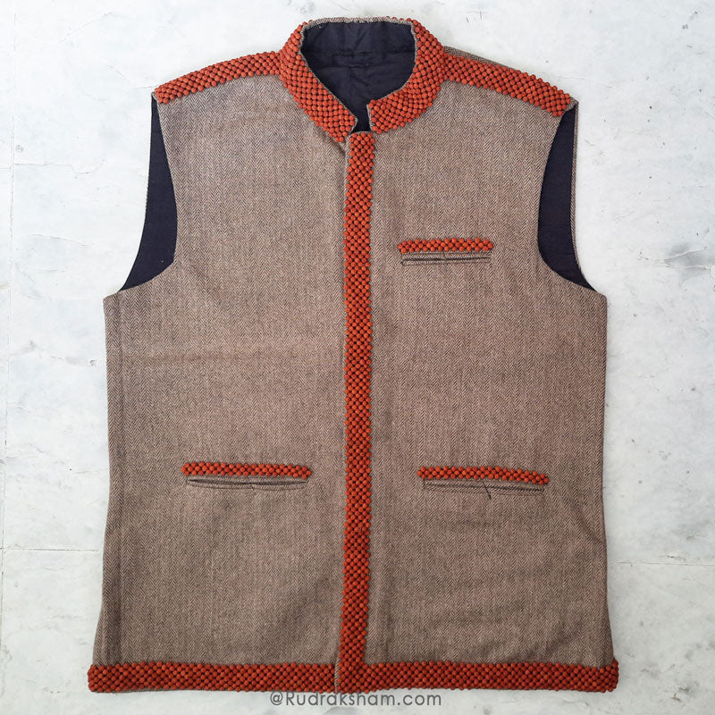 Khadi Rudraksha Jacket : Rudraksha Jacket has been hand made by stitching more than 3200 Rudraksha beads of size 6 mm all cross the jacket. Sides, Pockets, collar and back have been intricately designed by Rudraksha Lace. India's heritage industry is now poised to sport a chic new look in an attempt to innovate, recreate and embrace modernity. A series of garment have been designed from this exclusively hand-woven and handspun fabric. In some collections a blend of polyester also known as Poly - Vastra Khadi has been used to increase the durability of the fabric, yet the fabric continues to be wholly hand-woven following steps of it's cultural heritage.