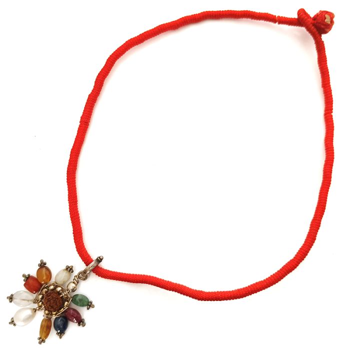 Pendant Details : Handmade Pendant containing 1 set of 9 Gem Stones ( Navratna Beads ) and a center Rudraksha Bead in Silver Wire with Silver Accessories and Red Thread. Total Number of beads 10.