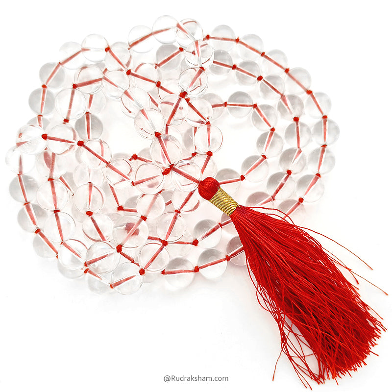 Sphatik ( Crystal Stone ) is a white shiny and transparent stone also called Quartz. According to Astrology, Sphatik ( Crystal ) is related to Planet Venus. Crystal / Quartz is a substitute of Diamond. Quartz Gemstones are popular among Gem therapists because they produce electrochemical balance in the body and remove anxiety, and make one calm and aid in concentrating. Using a Mala rosary made from Sphatik / crystal gives concentration, cools the body, and calms the mind. Wearing a crystal mala ensures a sound and undisturbed sleep. Crystal rosaries ( mala ) are used to count mantras while worshipping Laxmi, Durga, Saraswati and other Goddesses. If a Crystal Mala is worn, the mind becomes pacified and quiet. He who wears the Quartz stone mala, becomes pacified and quiet and favorite of Lord Shiva.