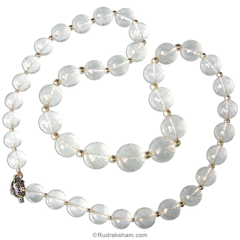 Sphatik ( Crystal Stone ) is a white shiny and transparent stone also called Quartz. According to Astrology, Sphatik ( Crystal ) is related to Planet Venus. Crystal / Quartz is a substitute of Diamond. Quartz Gemstones are popular among Gem therapists because they produce electrochemical balance in the body and remove anxiety, and make one calm and aid in concentrating. Using a Mala rosary made from Sphatik / crystal gives concentration, cools the body, and calms the mind. Wearing a crystal mala ensures a sound and undisturbed sleep. Crystal rosaries ( mala ) are used to count mantras while worshipping Laxmi, Durga, Saraswati and other Goddesses. If a Crystal Mala is worn, the mind becomes pacified and quiet. He who wears the Quartz stone mala, becomes pacified and quiet and favorite of Lord Shiva.