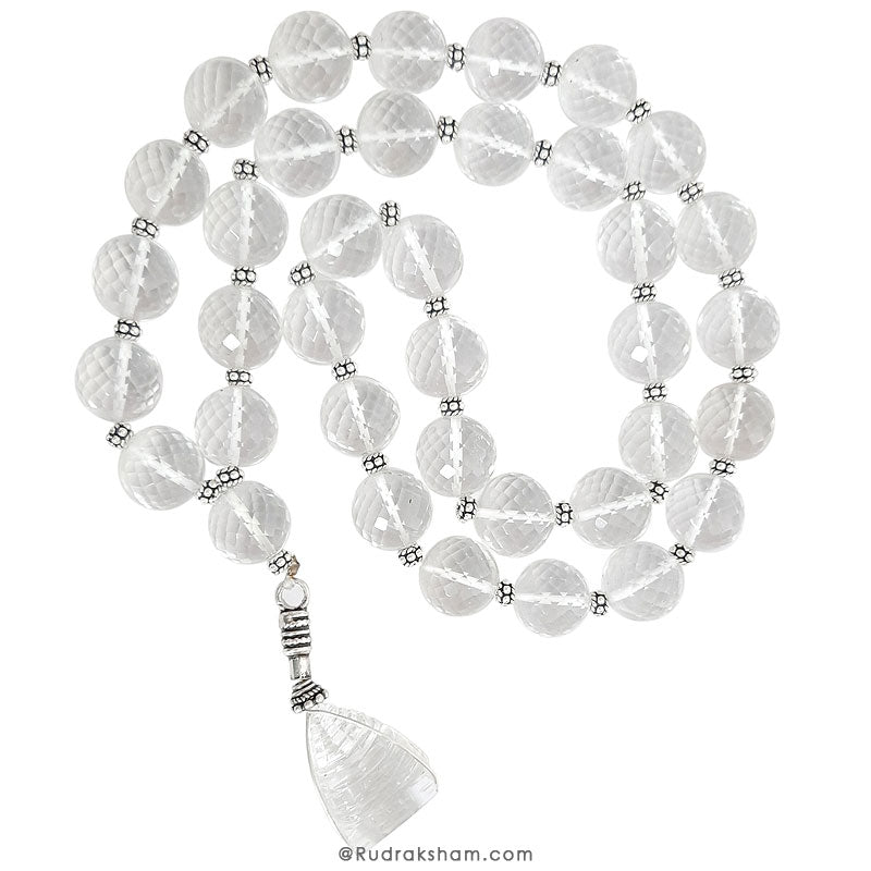 Sphatik Mala : Sphatik Mala to remove anxiety, makes one calm and for sound and undisturbed sleep. Sphatik ( Crystal Stone ) is a white shiny and transparent stone also called Quartz. According to Astrology, Sphatik ( Crystal ) is related to Planet Venus. Crystal / Quartz is a substitute of Diamond. Quartz Gemstones are popular among Gem therapists because they produce electrochemical balance in the body and remove anxiety, and make one calm and aid in concentrating. Using a Mala rosary made from Sphatik / Crystal gives concentration, cools the body, and calms the mind. Wearing a Crystal mala ensures a sound and undisturbed sleep. Crystal rosaries ( mala ) are used to count mantras while worshipping Laxmi, Durga, Saraswati and other Goddesses. If a Crystal Mala is worn, the mind becomes pacified and quiet. He who wears the Quartz stone mala, becomes pacified and quiet and favorite of Lord Shiva.